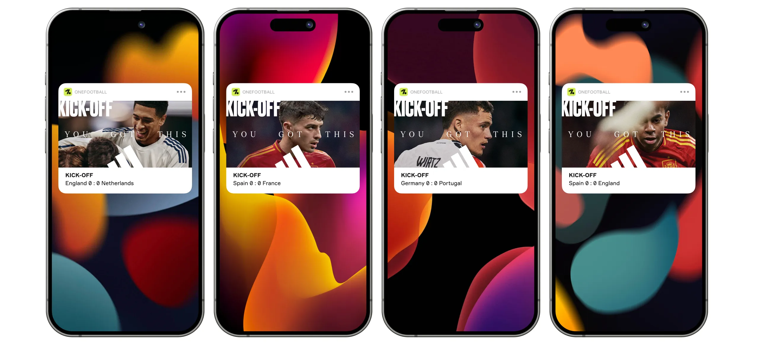 For Euro 2024, adidas asked OneFootball to design and build push notifications that introduced a new era of adidas-sponsored athletes. The campaign spotlighted rising stars like England's Jude Bellingham, Spain's Lamine Yamal and Pedri, and Garmeny's Florian Wirtz.