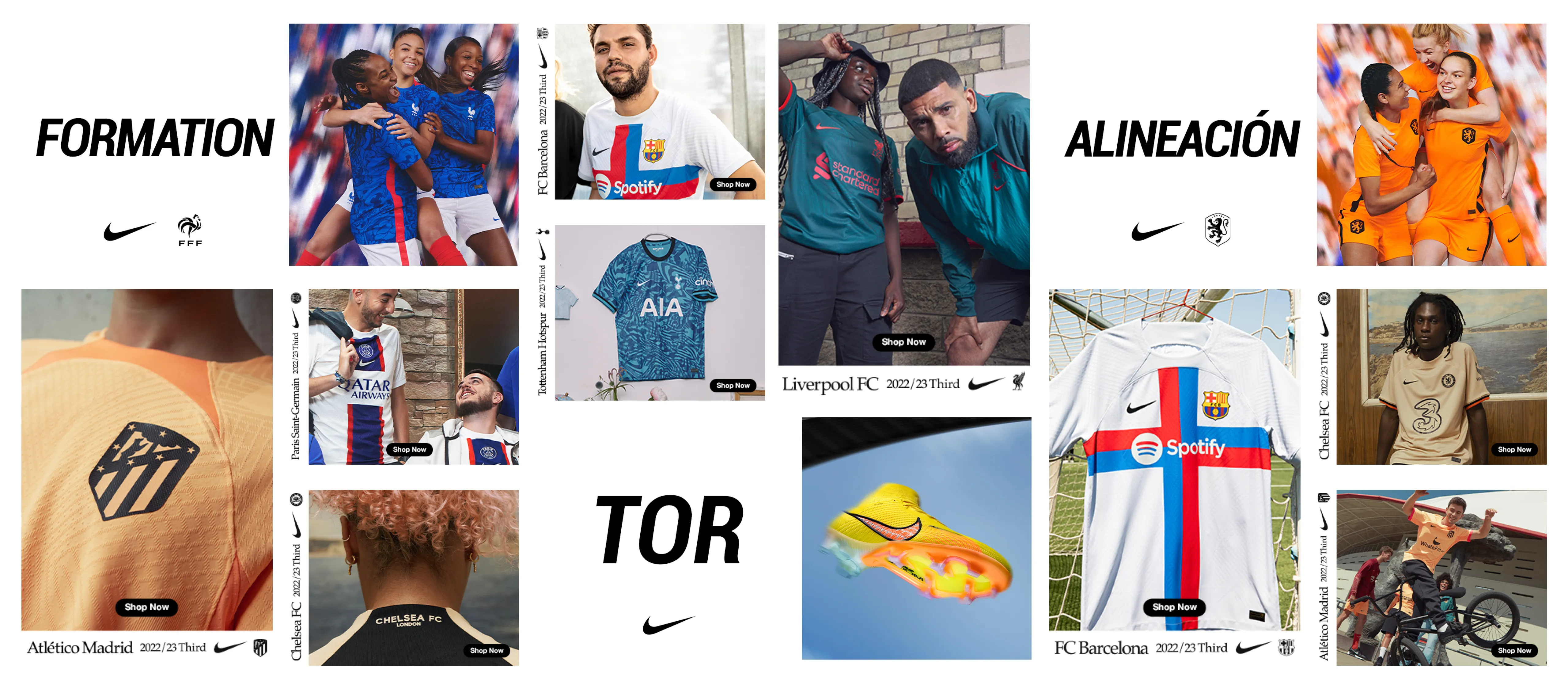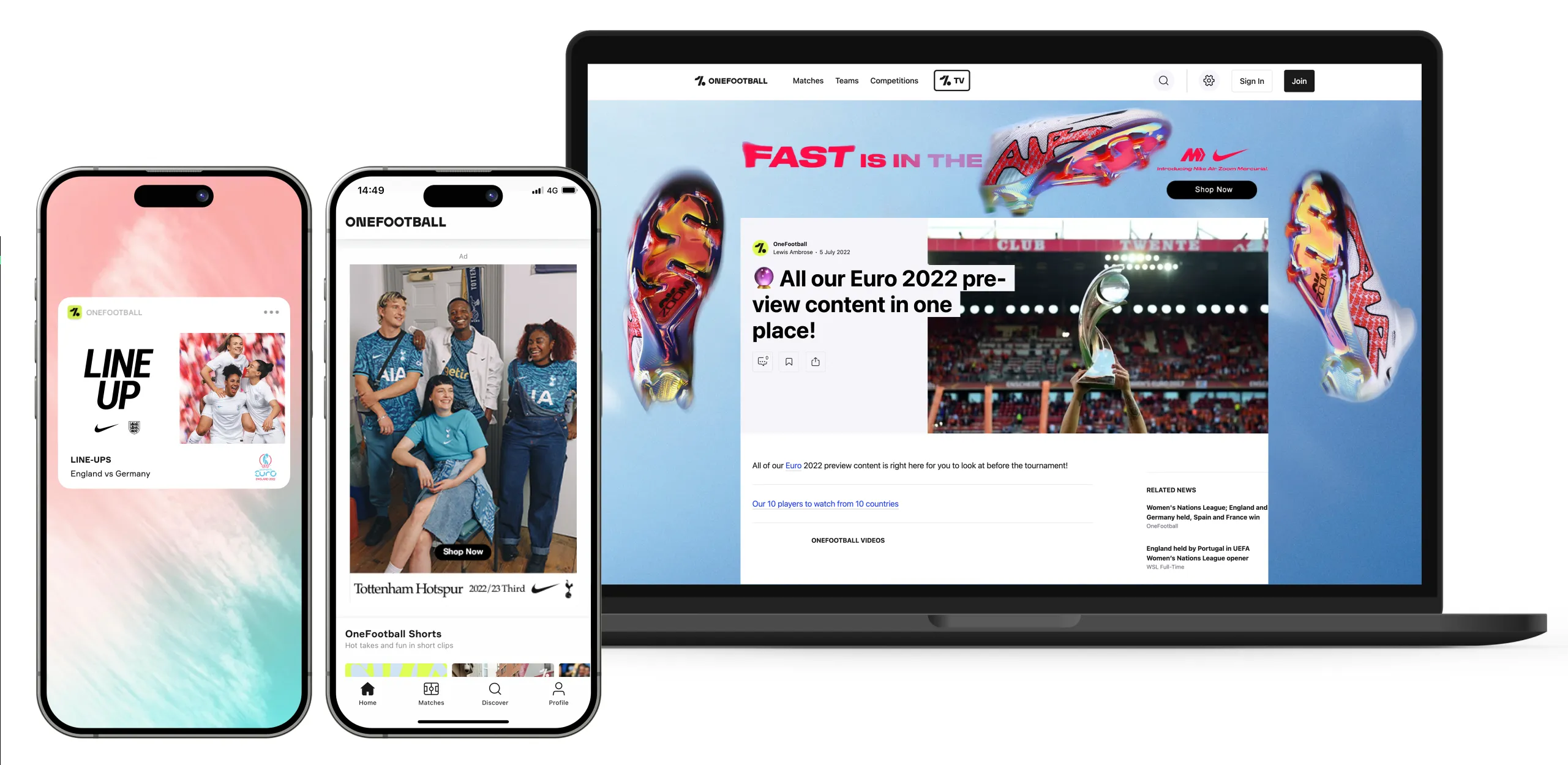 In summer 2022, Nike FC asked OneFootball to produce a range of assets promoting the latest Nike Air Zoom Mercurial football boots and the 22/23 Club third kits. The campaign featured top clubs, including Barcelona, Chelsea FC, Tottenham Hotspur, Liverpool, Paris Saint Germain, and Atletico Madrid. To further amplify Nike FC’s presence during the UEFA Women's EURO 2022, we created targeted push notifications highlighting the England, France, and Netherlands Women's National Teams.